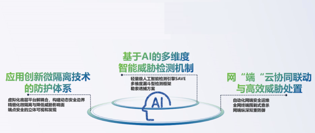 基于业界前沿的网端纵深联动技术,终端和边界的安全能力实现融合提升,内网未知威胁可以精确识别判定。通过全网威胁定位和一键查杀能力,对威胁进行快速检测和响应,帮助安全人员实现终端极简运维。